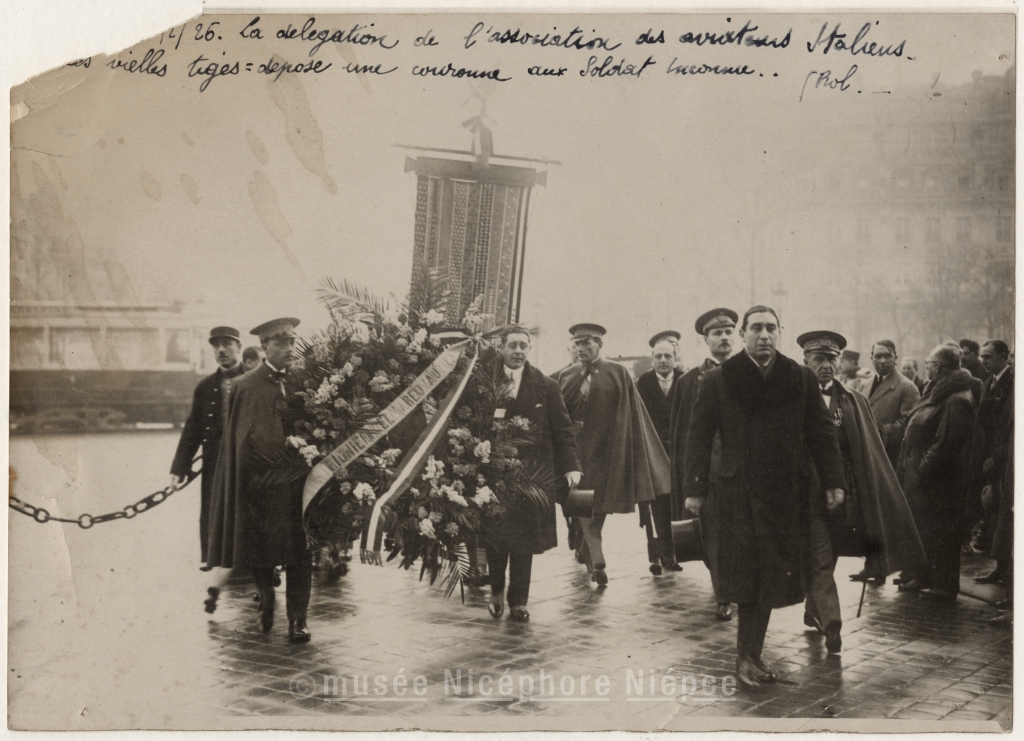 Paris - La délégation de l'association des / aviateurs italiens les vieilles tiges dépose une / couronne au Soldat Inconnu