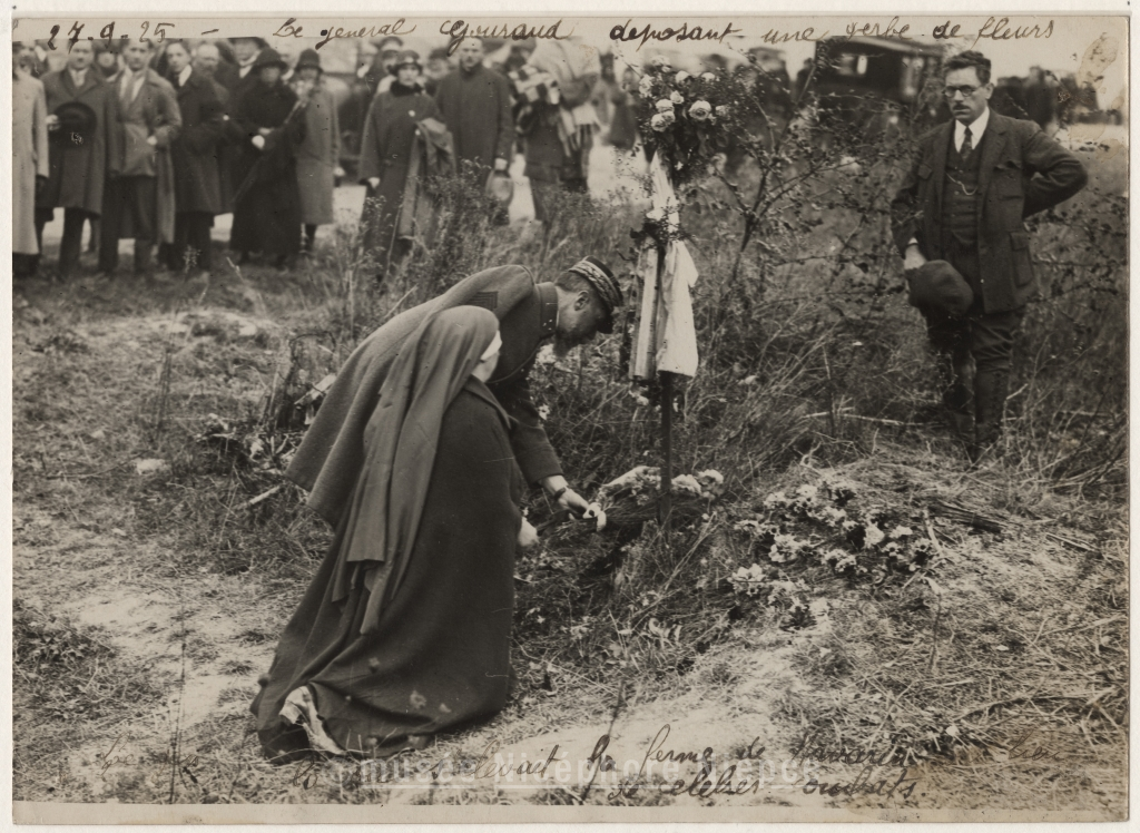 Le Général Gouraud / déposant une gerbe de fleurs, là où s'élevait / la ferme de Navarin lieu de célèbres combats