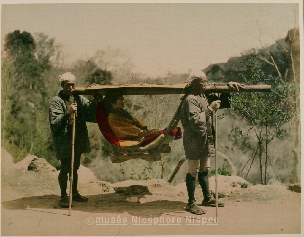 Femme japonaise dans un palanquin porté par deux hommes