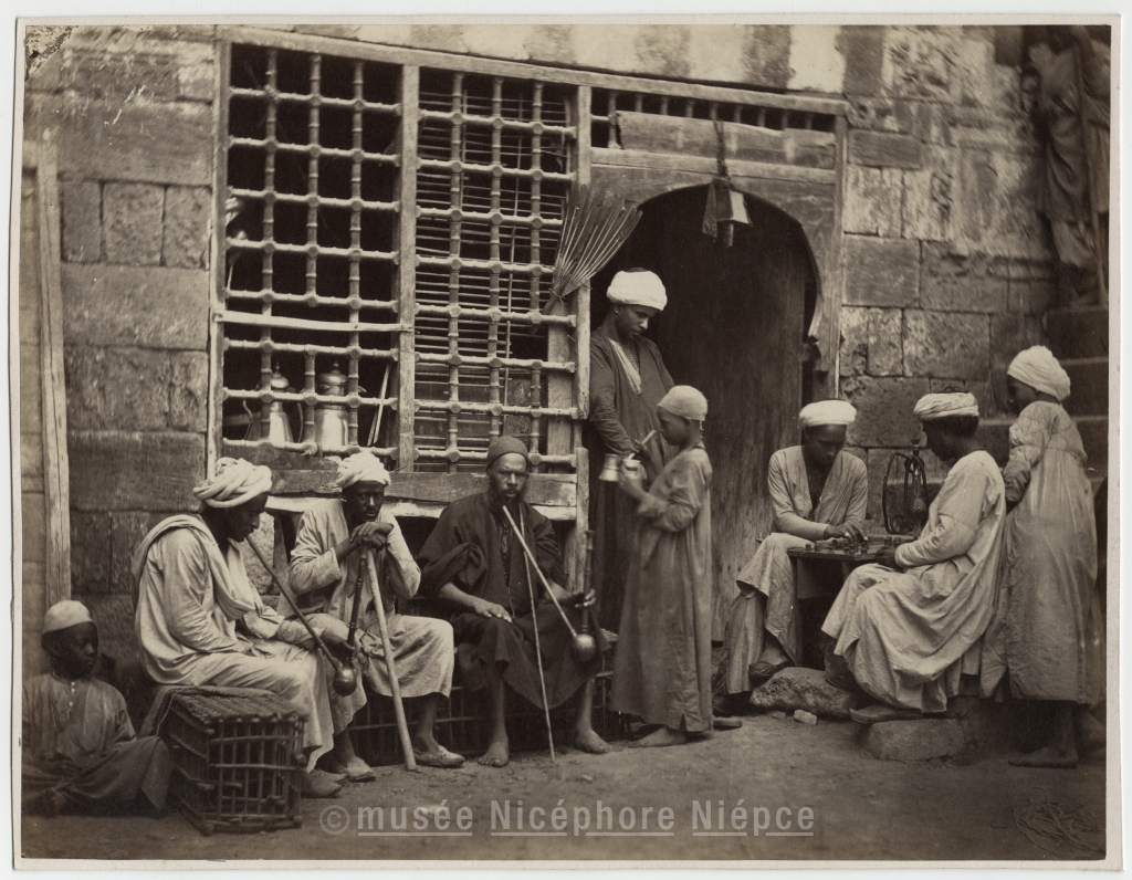 Groupe d'hommes devant un café Egyptien