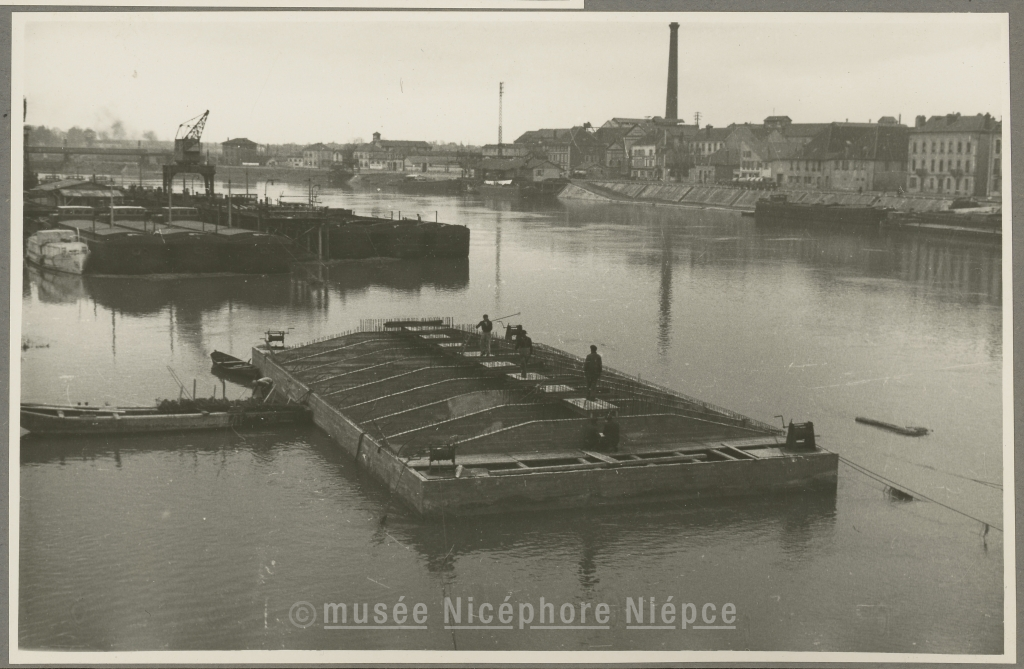 Construction aux Chantiers Schneider et mise à l'eau des soubassements des deux futures piles du nouveau pont Jean Richard Janvier 1950