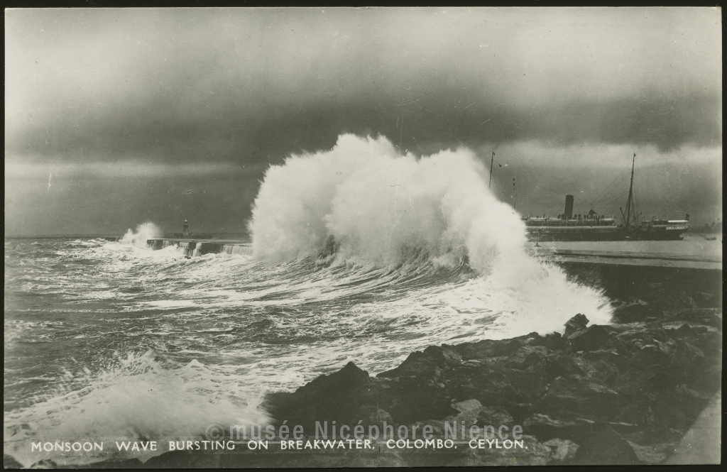 Monsoon wave bursting on breakwater, Colombo, Ceylan