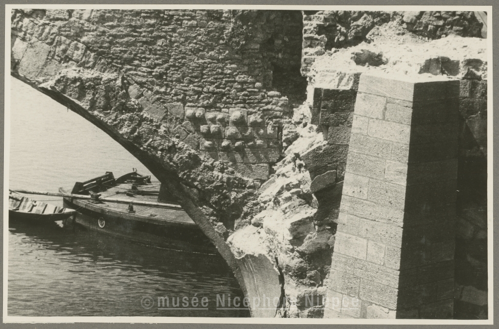 La démolition du pont Saint-Laurent fait apparaître l'appareil du pont de Moyen-Age, qui avait été élargi, à la fin du XVIIIè siècle, par Gauthey, Ingénieur des Etats de Bourgogne 7 Juin 1950