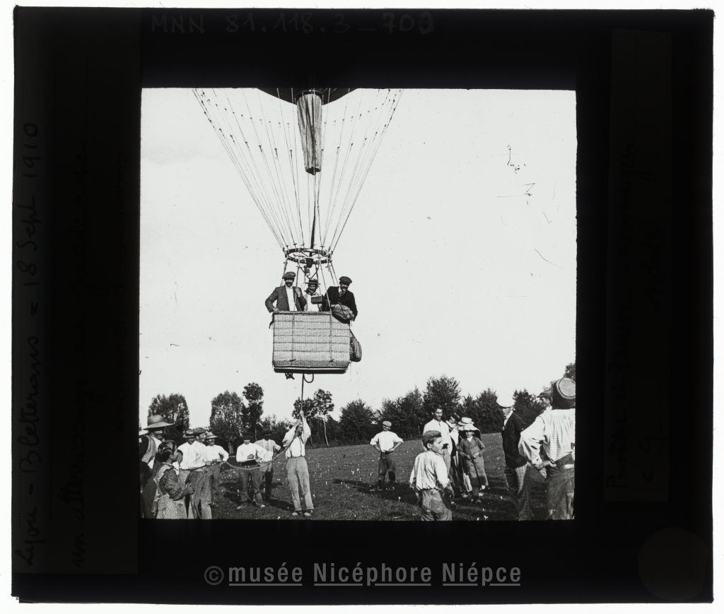 Lyon Bletterans 18 septembre 1910 / Un atterrissage au guiderope / Proton et Treyre - passagers / C.G. pilote