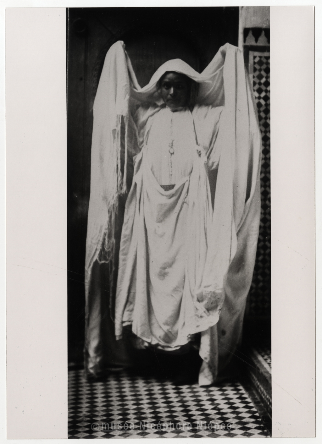 en pied - femme - portrait - costume traditionnel - en pose - voile - geste - suite de scènes - Maroc - Marocain - G. DE CLERAMBAULT