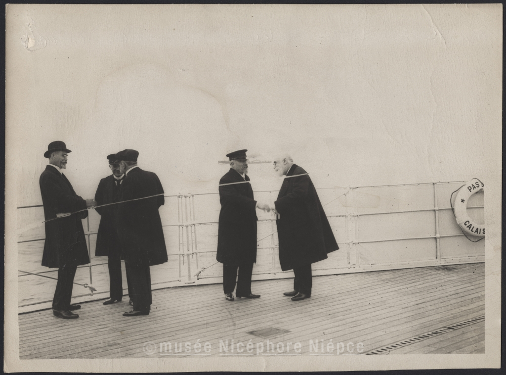 Deux personnalités se serrant la main sur le pont du Pas de Calais (Retour de Poincaré de Russie ?)