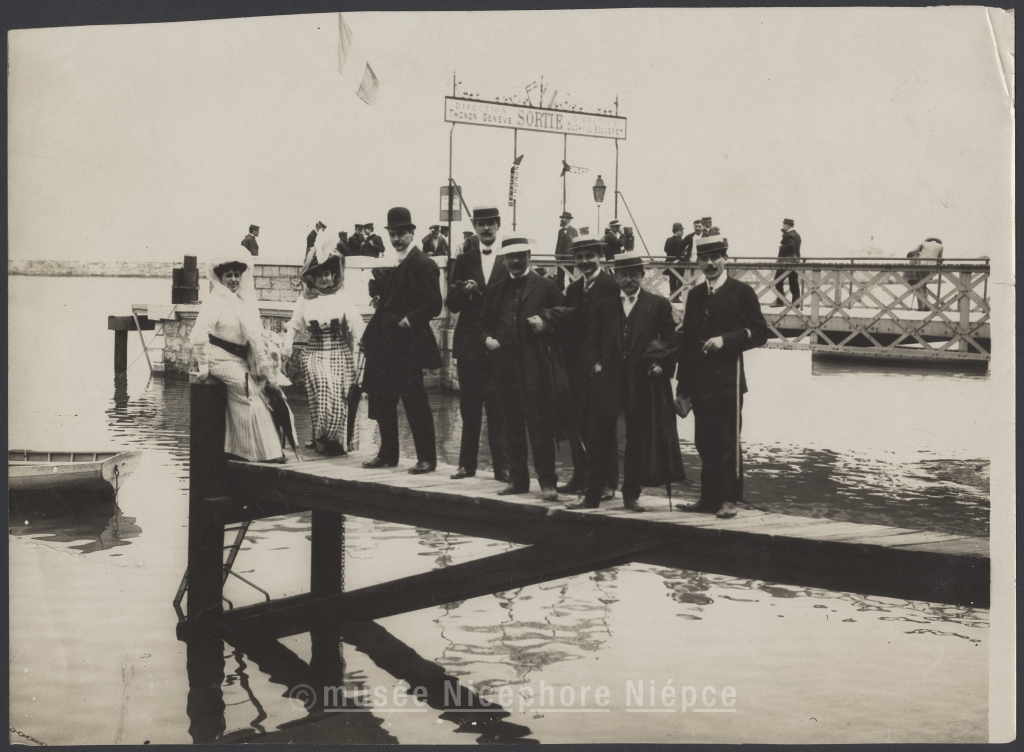Hommes en canotier et jeunes femmes sur un ponton au bord du lac Léman