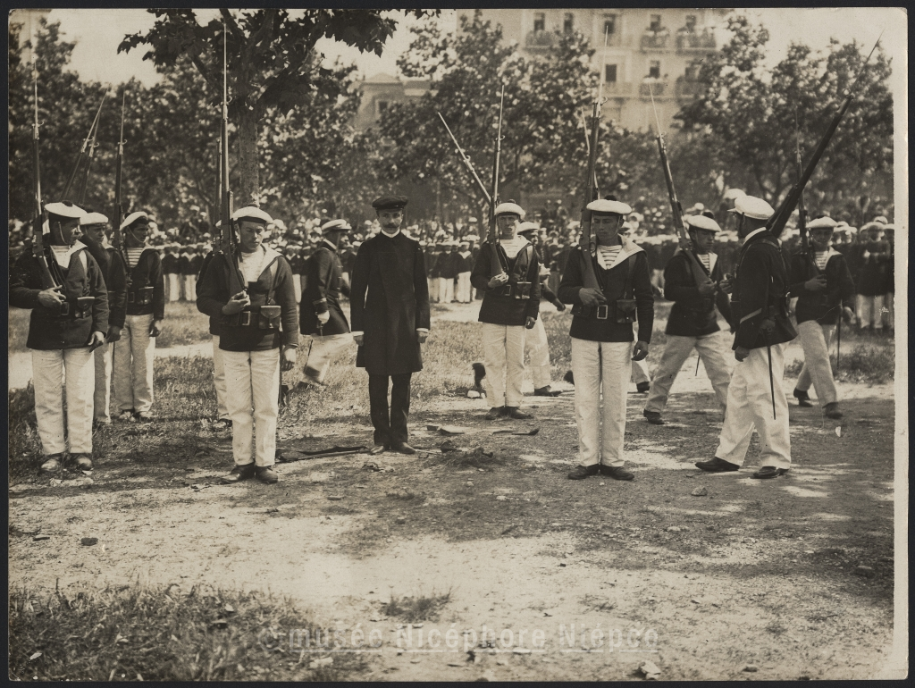 Après la dégradation. Ullmo entre les gardes / passe devant les troupes avant de regagner / sa prison