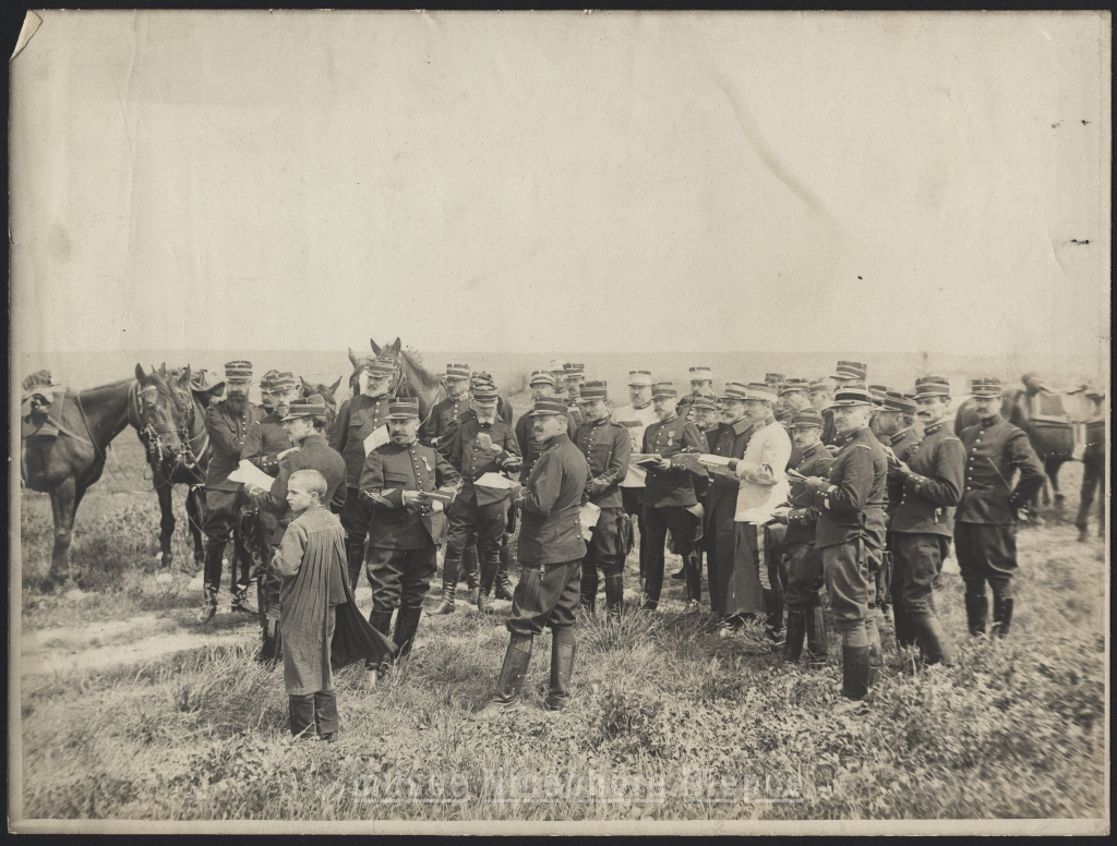 Régiment à l'arrêt dans la campagne, consultant leurs cartes.
