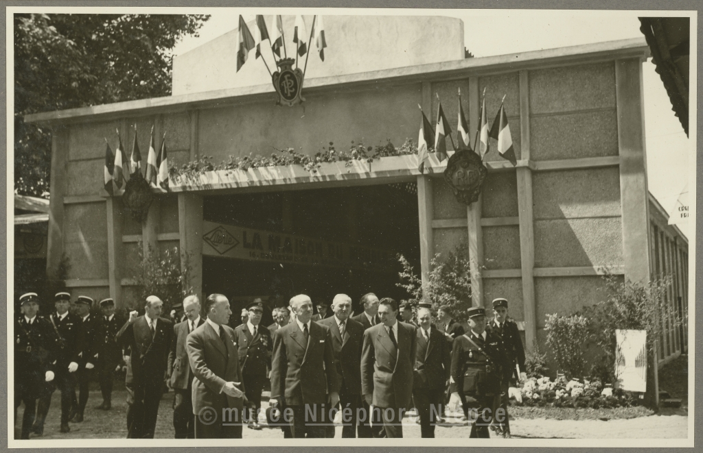 Monsieur le Ministre Jean Moreau visite la Foire-Exposition, entouré de M. Nouelle, Maire, M. Moynet, député de la S. et L., M. Charles Gros, président du Comité 22 Juin 1952