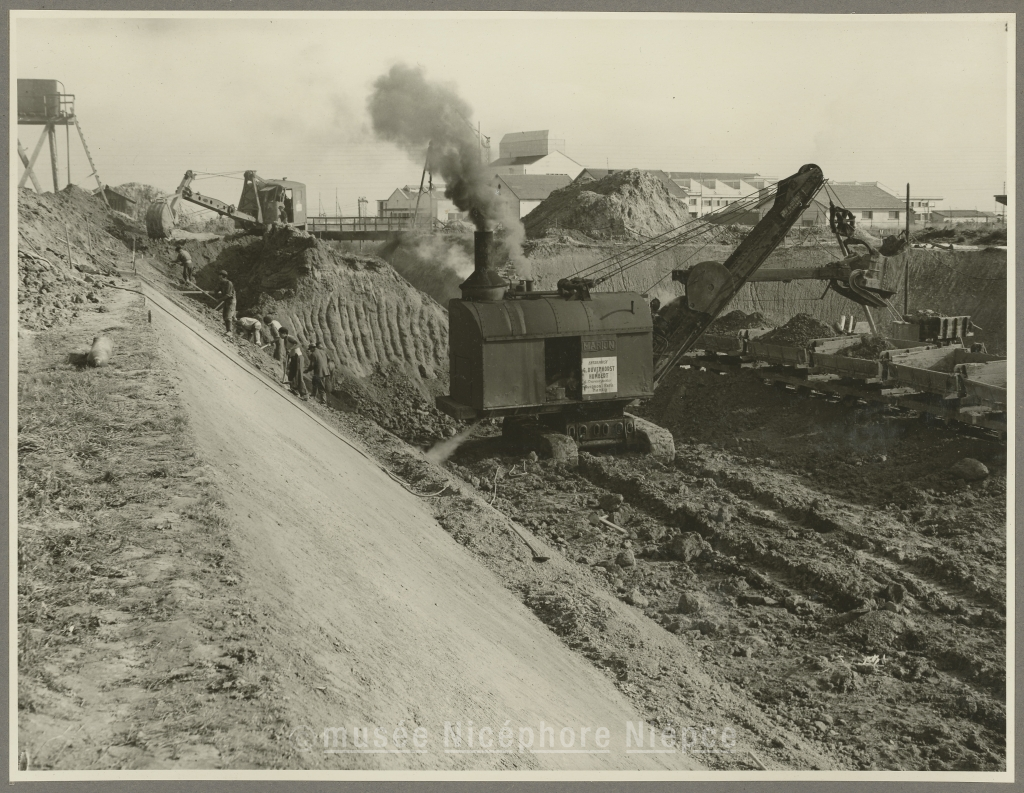 Travaux de la déviation du Canal du Centre par la zone industrielle (A l'horizon, la voie ferrée Chalon-Dole et l'Usine Philipps) 24 Septembre 1952
