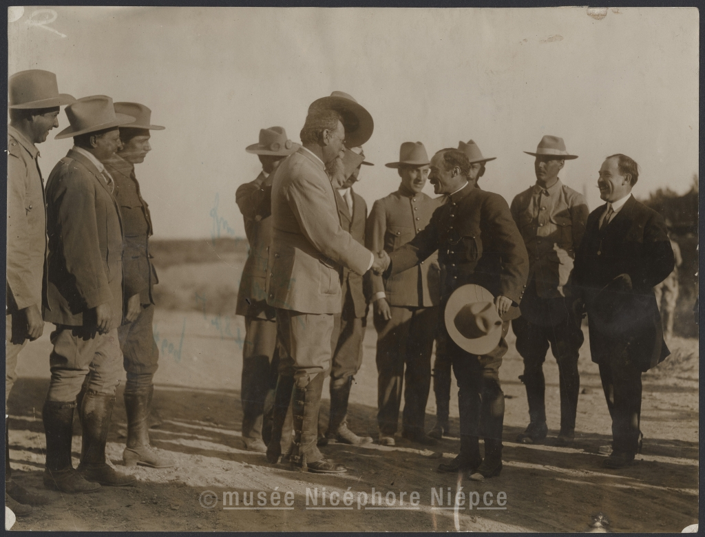 El general Garranza, jefe de los rebeldes, saludado por el. gen. Chao a su llegada à los alrededores de Ciudad Juares