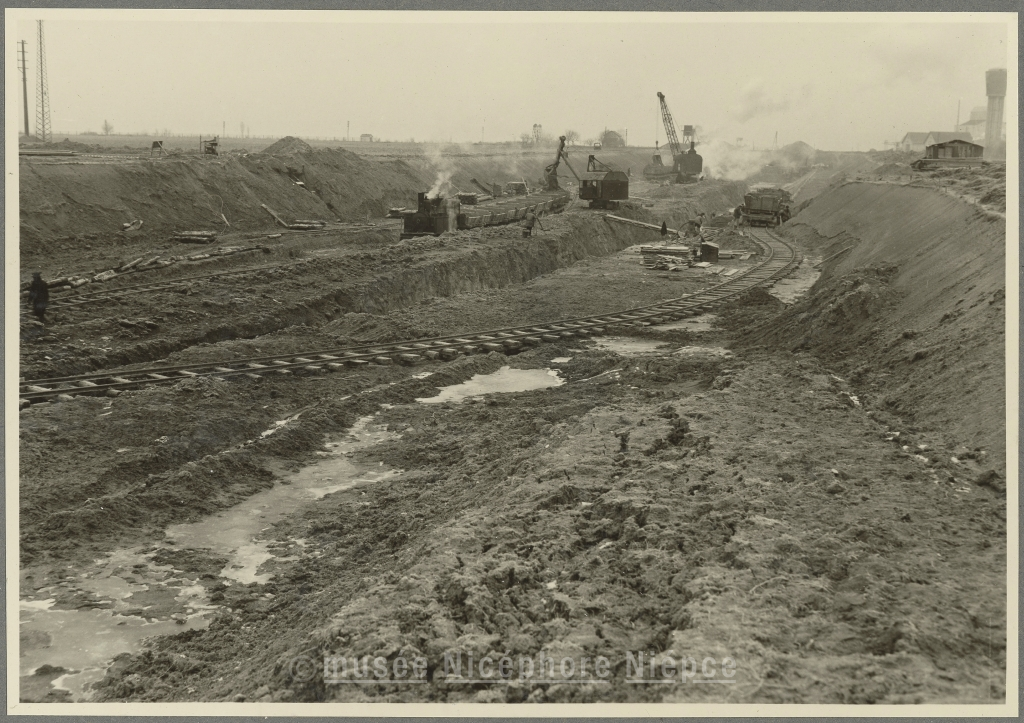 La déviation du Canal du Centre par la zone industrielle (Vue prise en direction du Sud : à droite, l'usine Philipps). Fin Janvier 1953