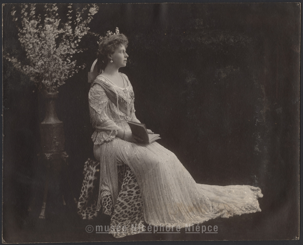 fleur - assis - portrait - livre - de profil - vase - ? - robe - bijou - reine de Roumanie - CHUSSEAU-FLAVIENS - MANDY