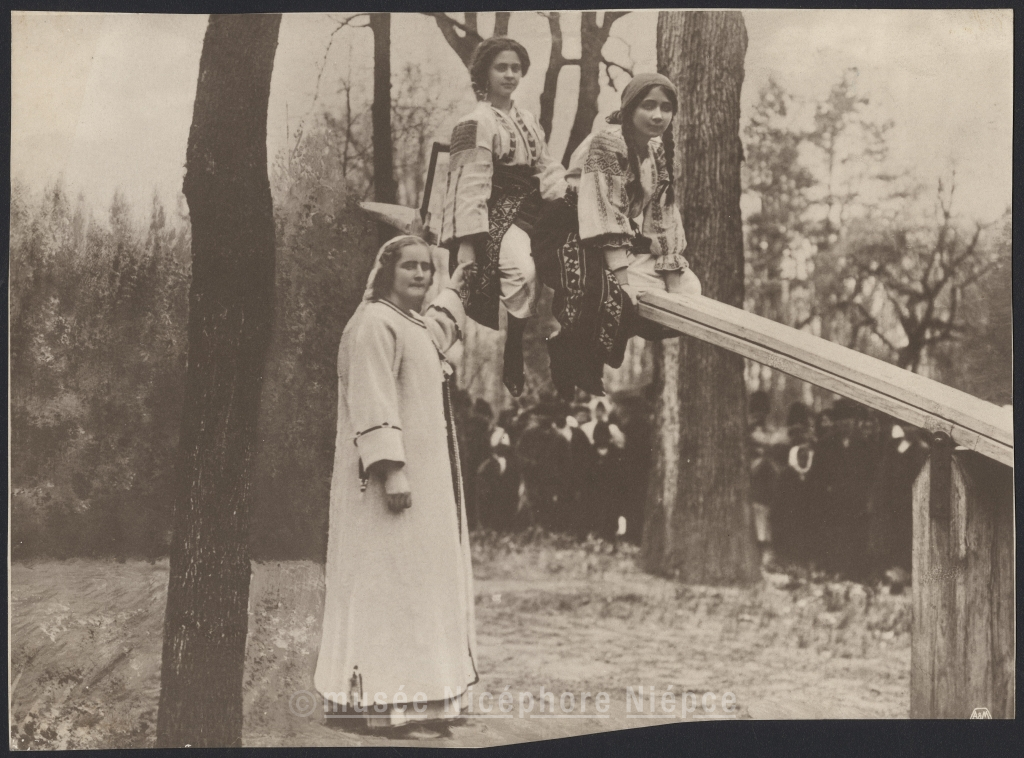 Reine de Roumanie et deux fillettes sur une balançoire