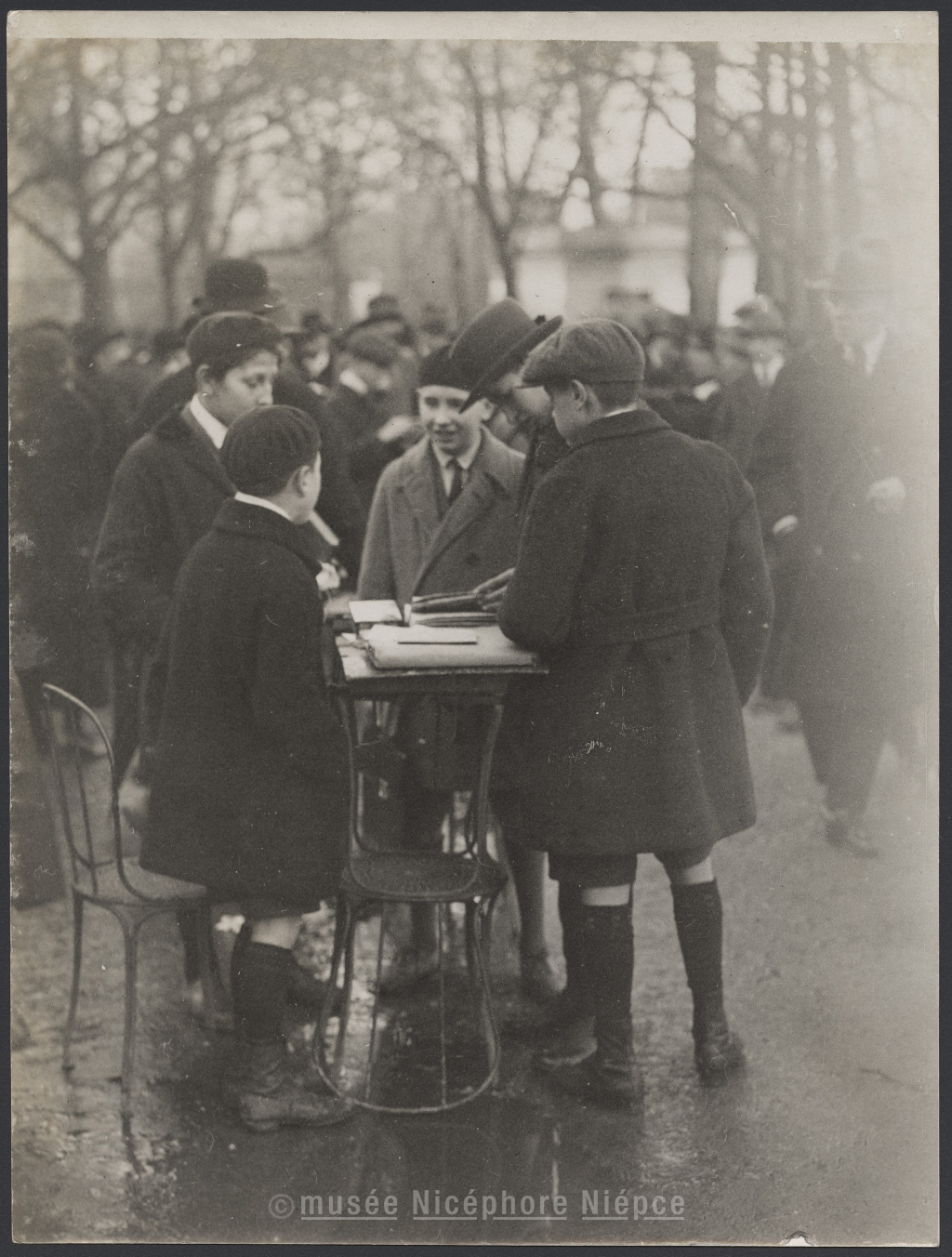 Cinq enfants autour d'une table dans la rue
