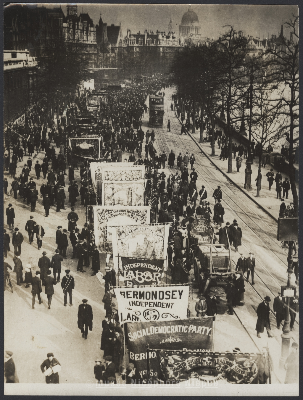 Le grand meeting de Londres en l'honneur des chefs travai- / llistesde l'Afrique du Sud. / le cortège sur le Victoria Embankment.
