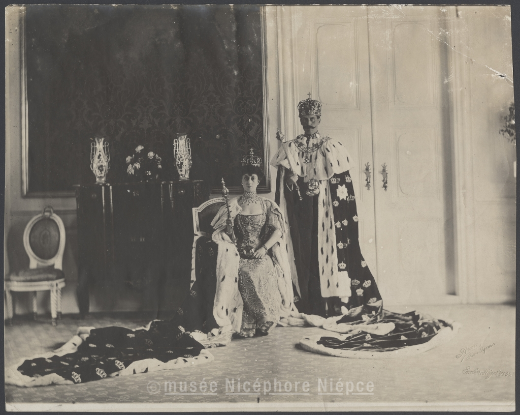 Le roi Haaken VII et la reine Maud de Norvège dans leur costume de sacre