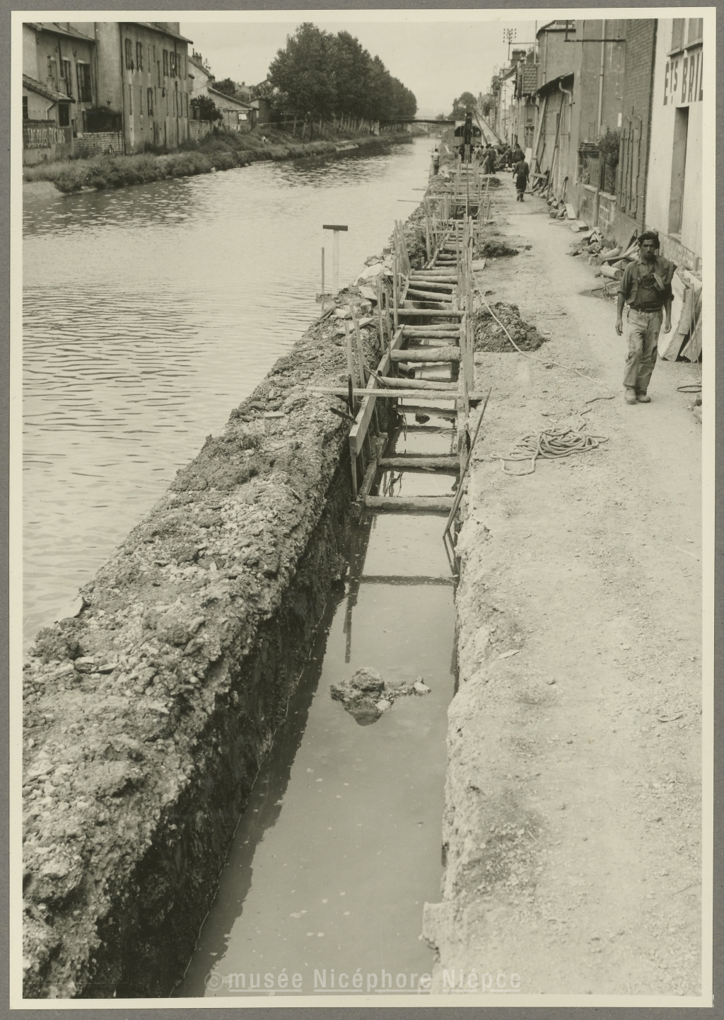 Construction du grand collecteur d'égouts Nord-Sud, du quartier de l'Aubépin à la rue Porte de Lyon Travaux sur la levée du canal du Centre, entre le pont Garibaldi et le pont de la Colombière 10 Septembre 1954