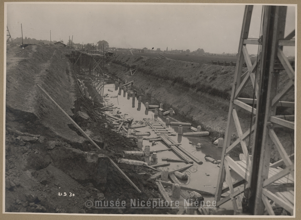 Vues des travaux de la Centrale thermique, au 21 mai 1930.-Petites inondations de mai 1930, avec la digue de la route endommagée. (cette digue fut édifiée en 1929 par la Sté "Formo-Centre") Les travaux de la future soute à charbon