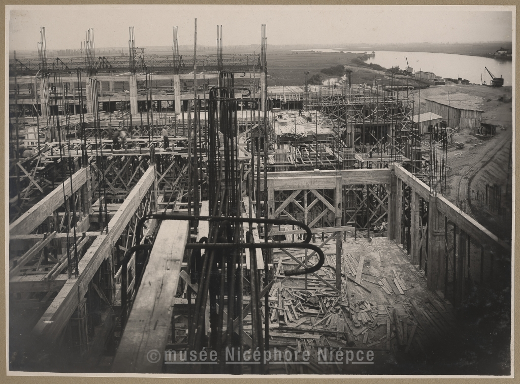 Vues des travaux de la Centrale thermique, au 21 mai 1930.-Petites inondations de mai 1930, avec la digue de la route endommagée. (cette digue fut édifiée en 1929 par la Sté "Formo-Centre") Au second plan, les méandres de la saône, en aval de la Centrale thermique de Formo-Centre