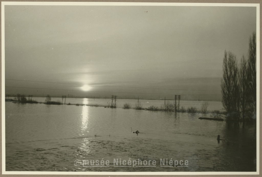 Inondations de Janvier 1955 La plaine inondée entre Chalon et St Marcel, au soir du 19 Janvier 1955