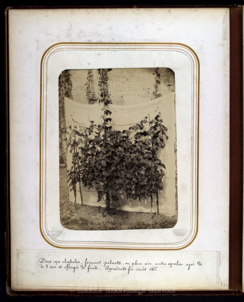 Deux ceps chasselas, formant palmette, en plein-air contre espalier, âgés de / 3 ans et chargéss de fruits. Reproduits fin août 1866