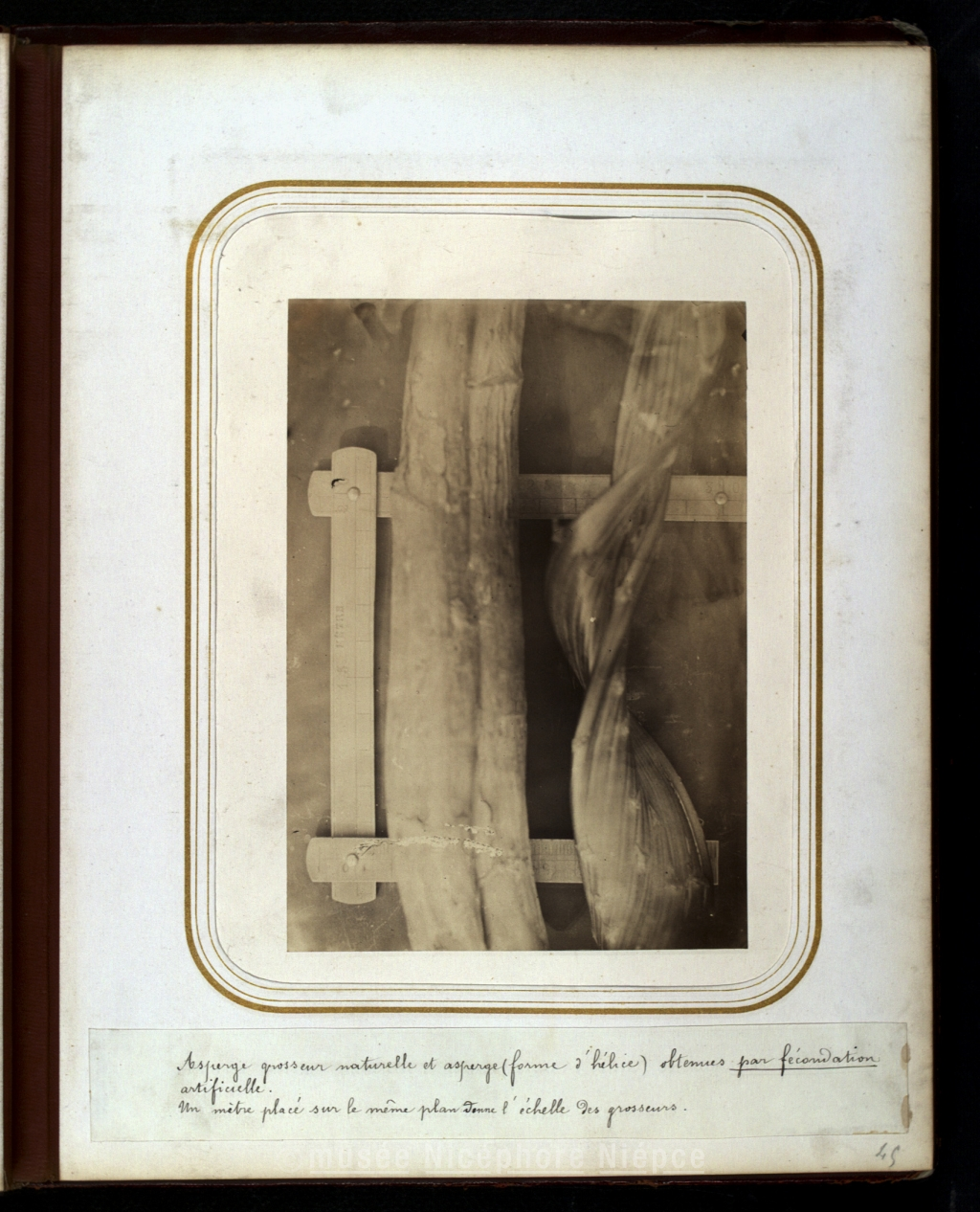 Asperge grosseur naturelle et asperge (forme d'hélice) obtenues par fécondation / artificielle / Un mètre placé sur le même plan donne l'échelle des grosseurs