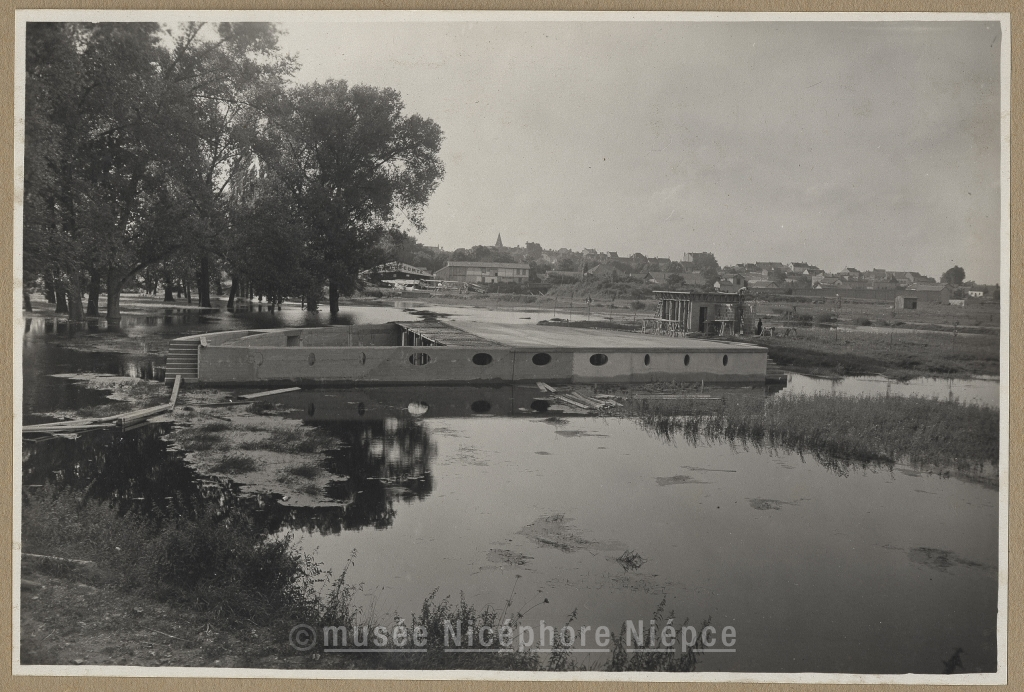 Parc de Chalon-sur-Saône : construction de la scène du futur théâtre de verdure. -états des travaux, arrêtés par une légère crue de la saône, fin juillet 1930