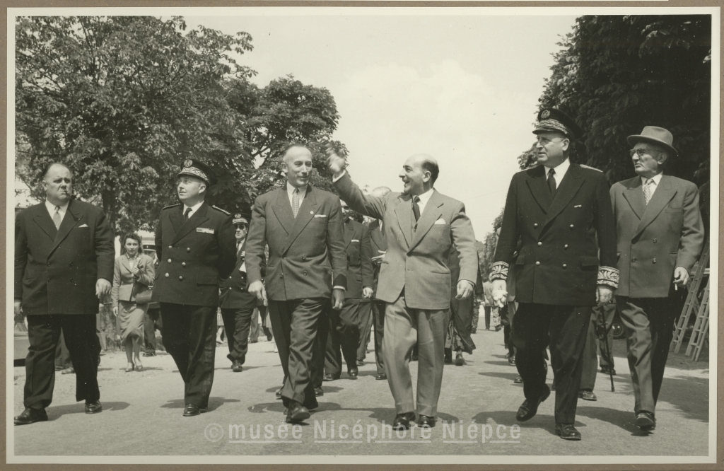Chalon-sur-Saône - scène - foire - inauguration - visite officielle - Nouelle Georges - maire - préfet - Gros Charles - salut - Charles GROS