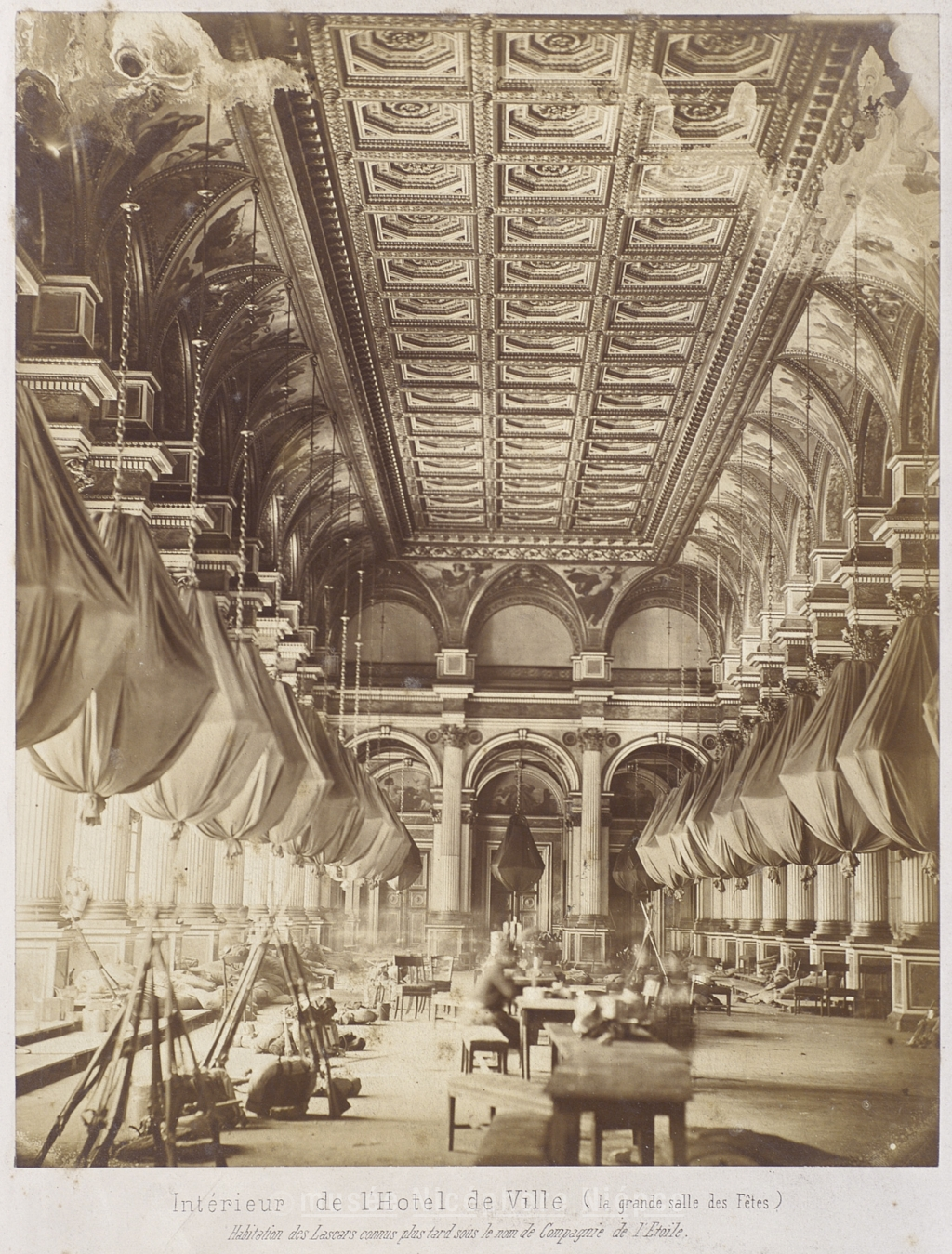 Intérieur de l'Hotel de Ville (la grande salle des Fêtes) / Habitation des Lascars connus plus tard sous le nom de Compagnie de l'Etoile.