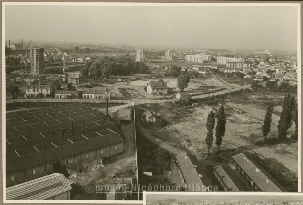 Quartier de l'Aubépin Immeubles B12.03, B12.01,L50.1,A5.01,L50.2 et A5.02 en construction Immeuble B12.05 Fondations des immeubles B12.06, B12.07 et B12.08 rue du Pont de Fer Usine de la SEVA et fondations de l'immeuble B12.09 17 Septembre 1956