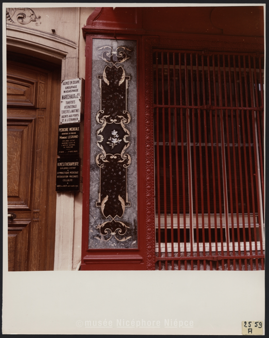 Détail d'un élément de vitrine de la boucherie de la Cité à Paris
