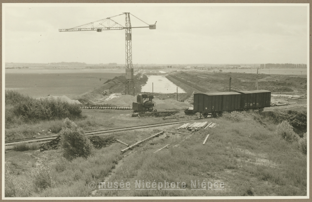 Zône Industrielle : Emplacement où s'élèvera la grande écluse ; au 1er plan, la voie ferrée desservant le port et qui doit être déplacée Juin 1957