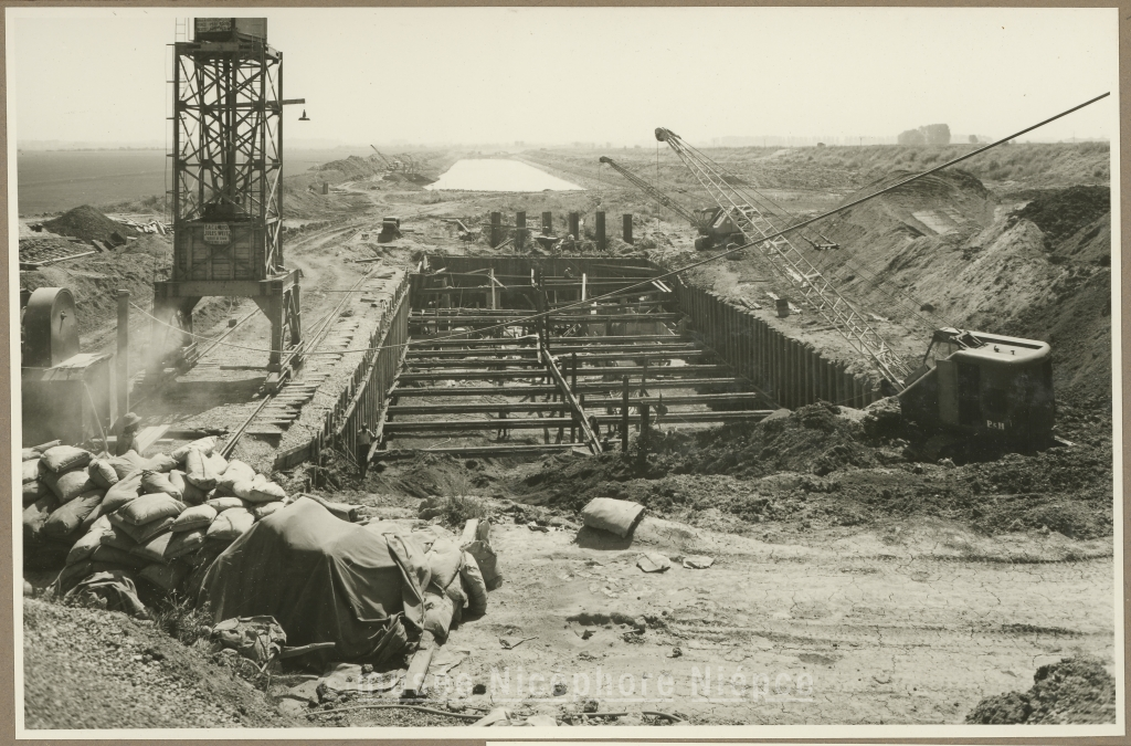 Premiers travaux de la construction de la grande écluse sur le dérivation du canal du Centre à travers la zône industrielle (Vue prise de la route Chalon-Crissey, C.D.5) 12 Août 1957