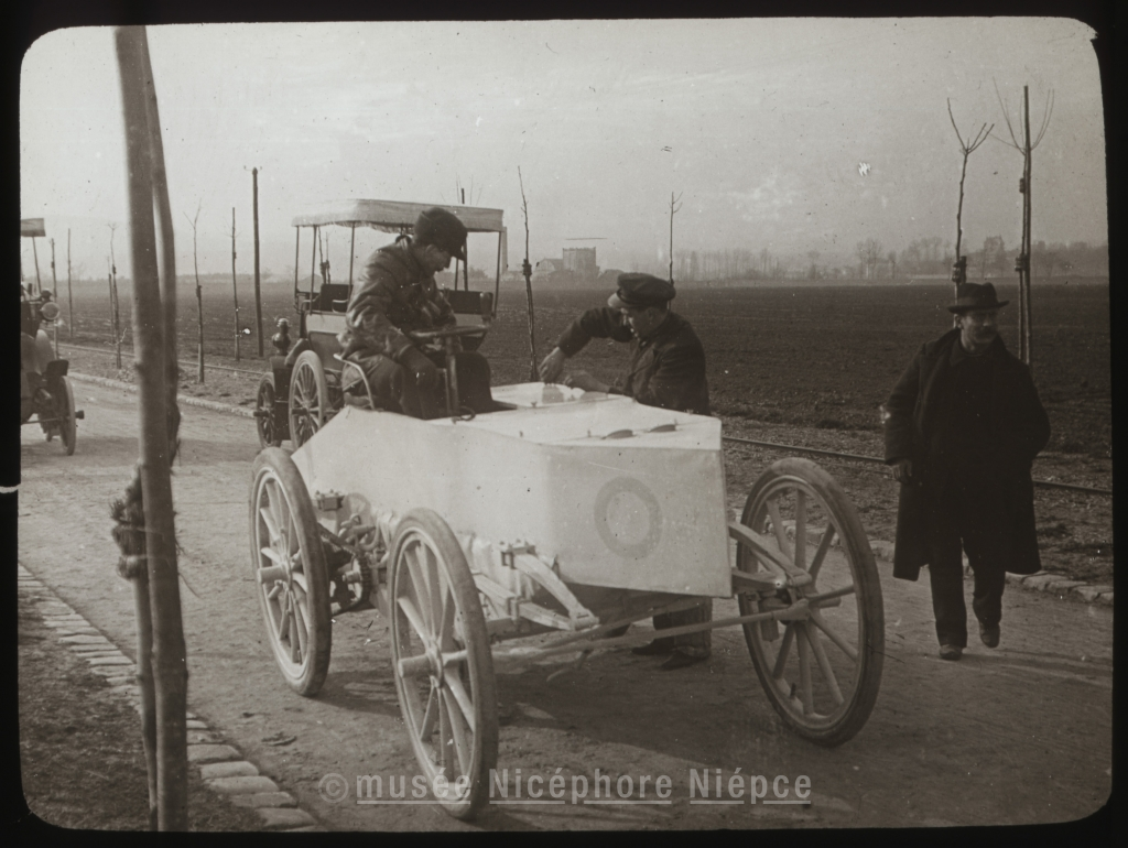 Le Comte Gaston de Chasseloup-Laubat sur sa Jeantaud à Achères avant la course (record de vitesse absolue sur 1 km)