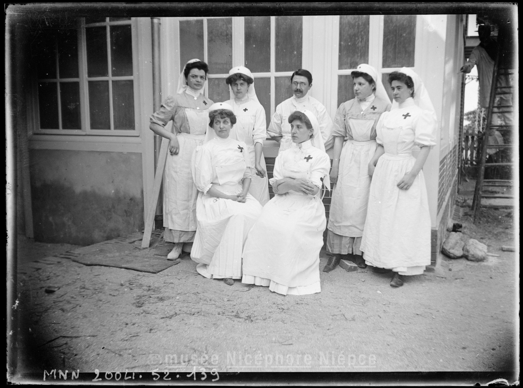 Portrait de groupe du personnel du dispensaire dont Germaine Demachy (?) (Soeur du photographe) au premier rang à gauche.