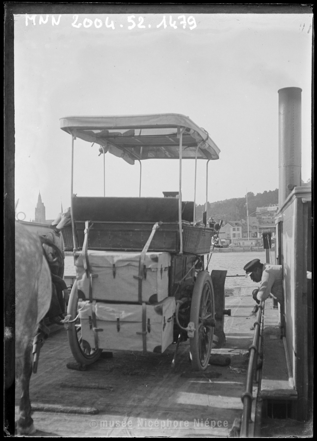 Première automobile des Demachy sur le bac pour Caudebec (léglise Notre-Dame au fond)