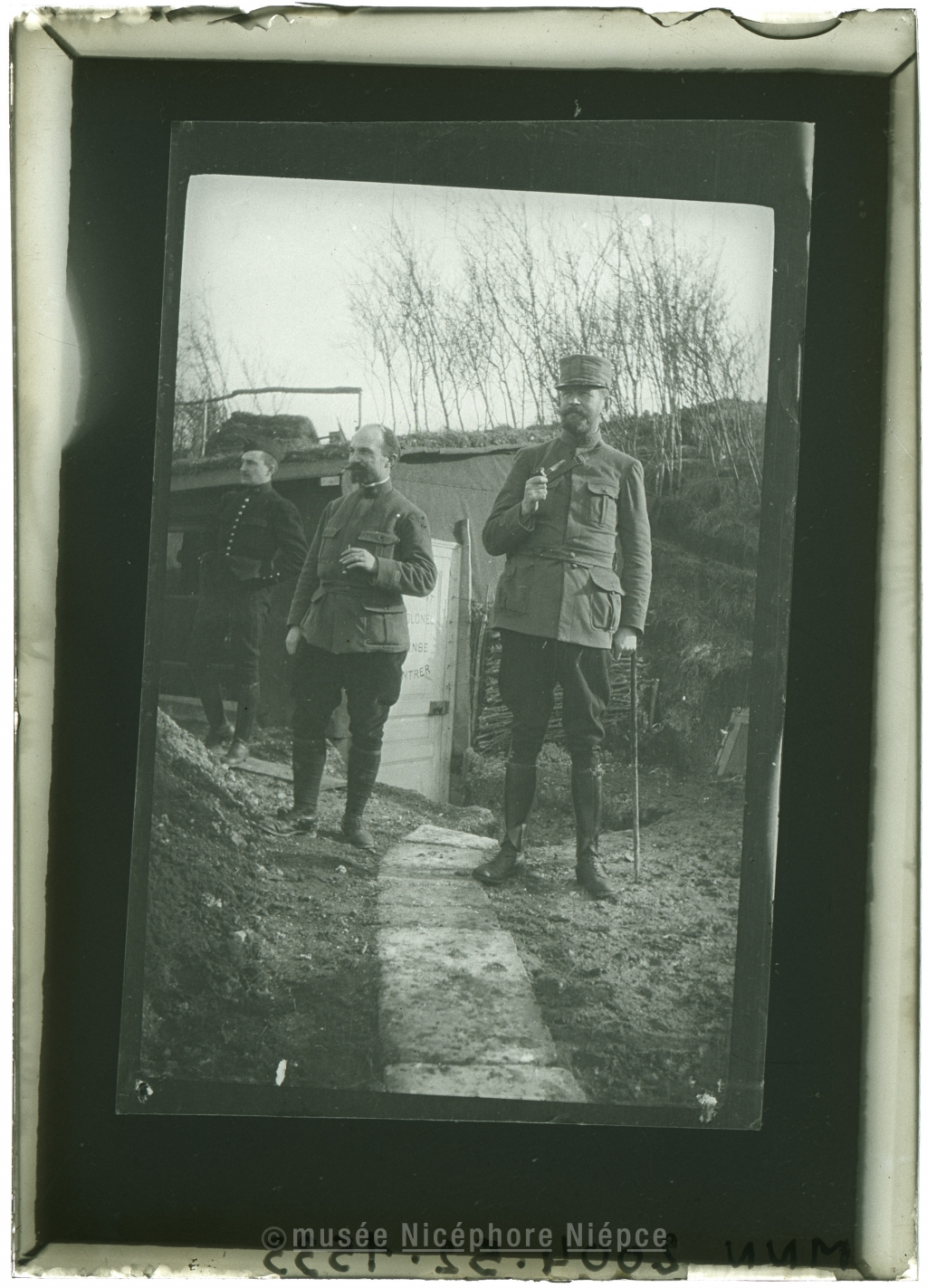 Trois militaires devant un baraquement (positif obtenu par contact avec un négatif souple réalisé au front par Bob Demachy)