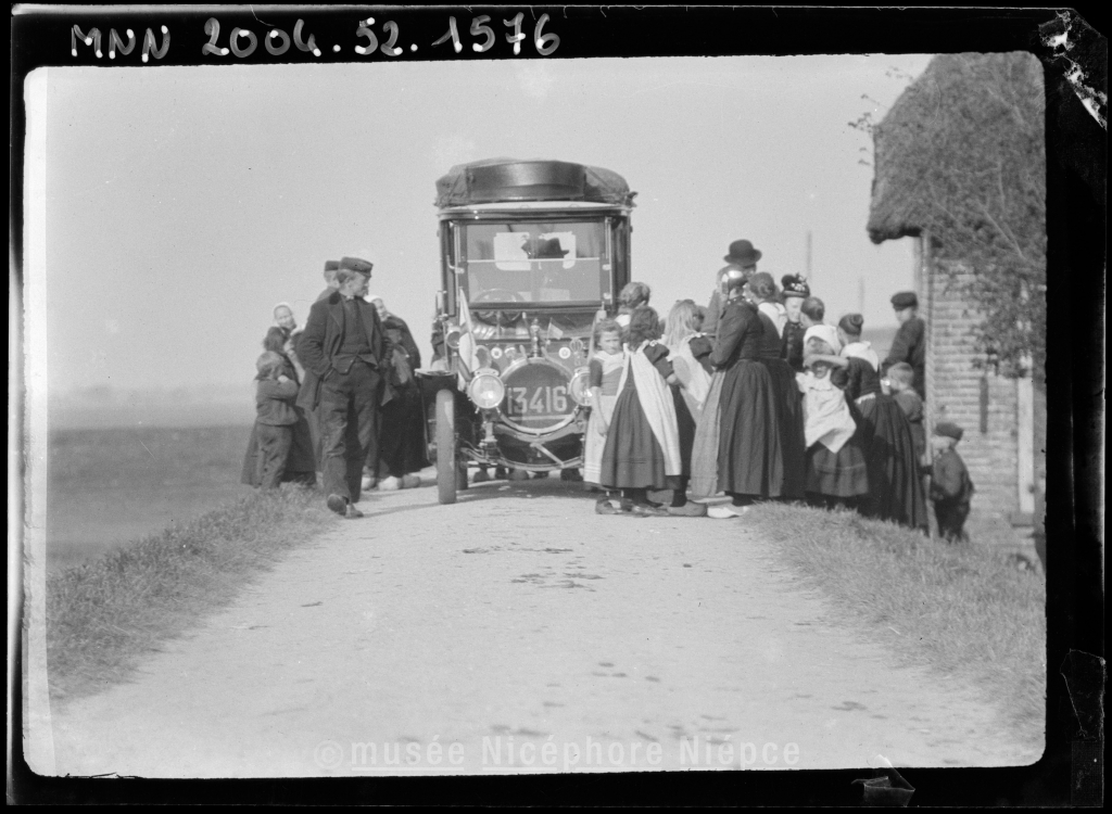 Attroupement autour d'une automobile sur une route de Hollande
