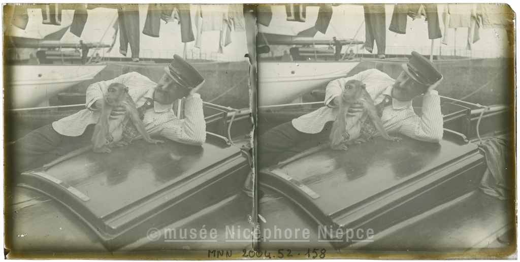 Homme allongé sur le pont dun bateau et tenant un singe dans ses bras