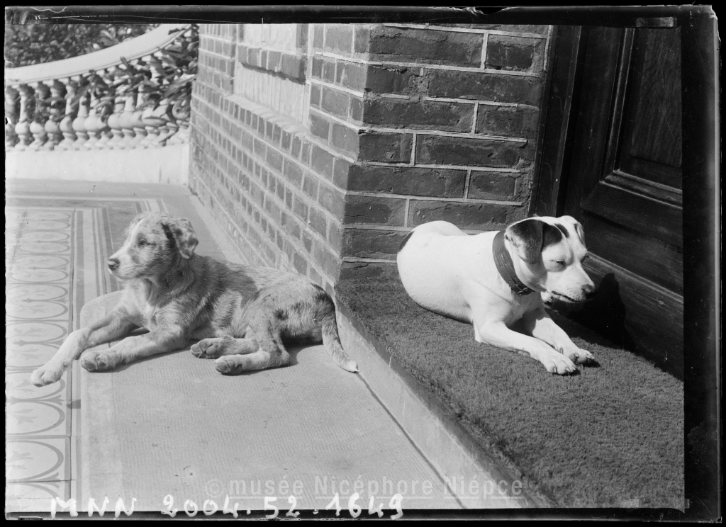 Chiots couchés sur la terrasse du château