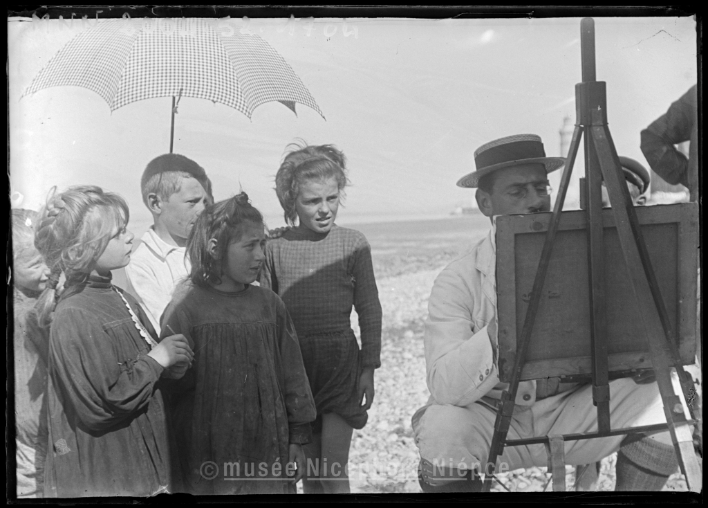 Peintre (M. Homère ?) observé par des enfants sur une plage