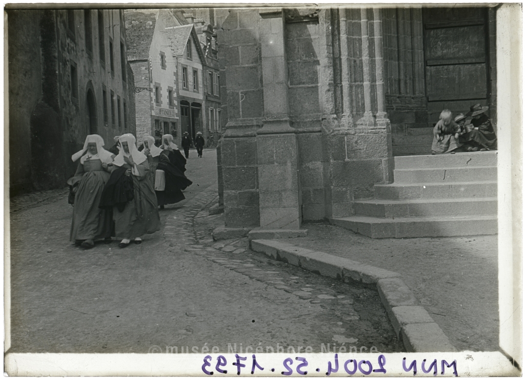 Bretonnes passant devant le portail de la chapelle du Kreisker à Saint-Pol-de-Léon