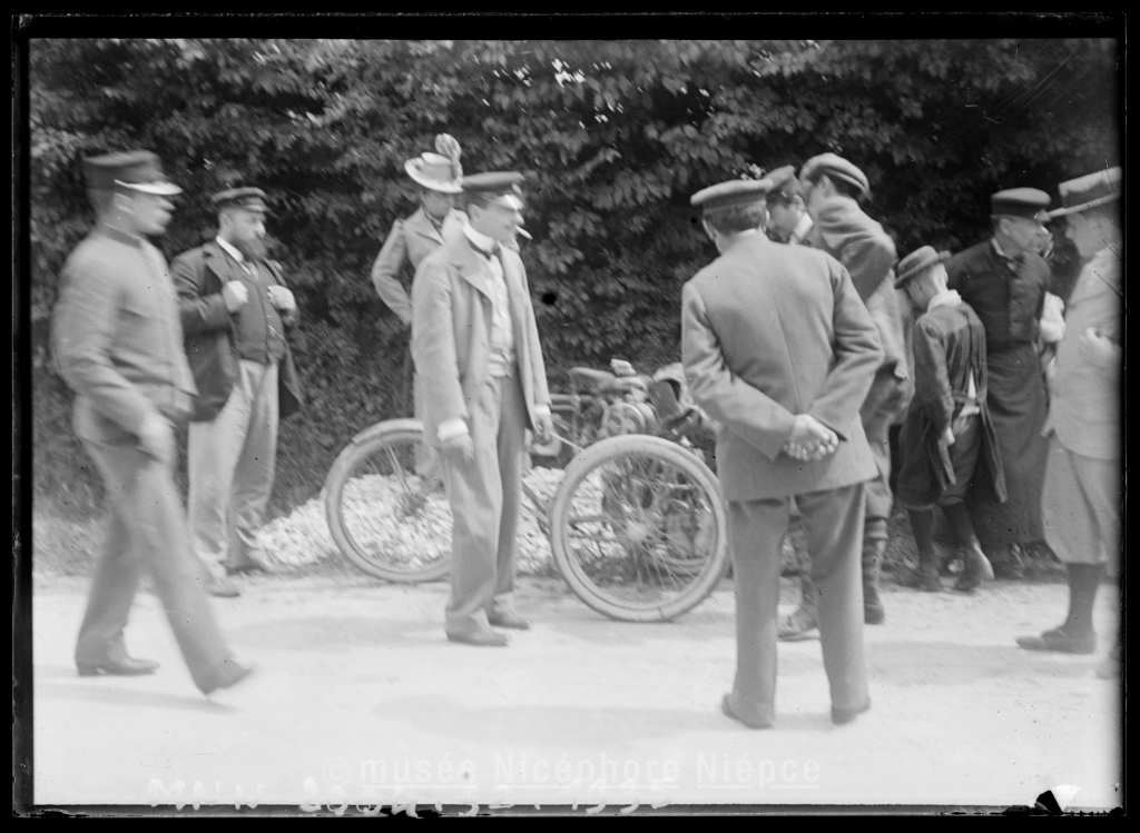 Vélomoteur (?) le long dune route à loccasion dune course