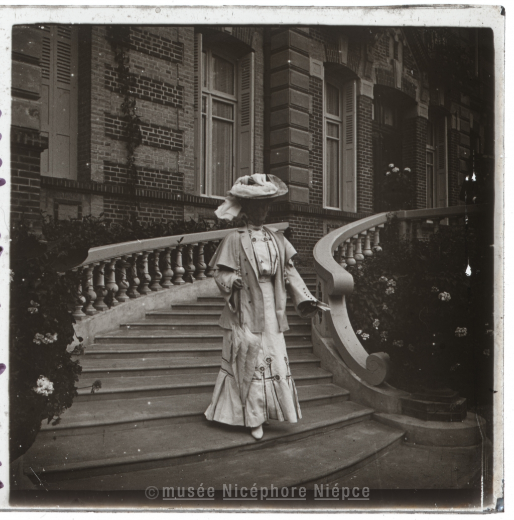 Mme Demachy (?) descendant lescalier de la terrasse du château