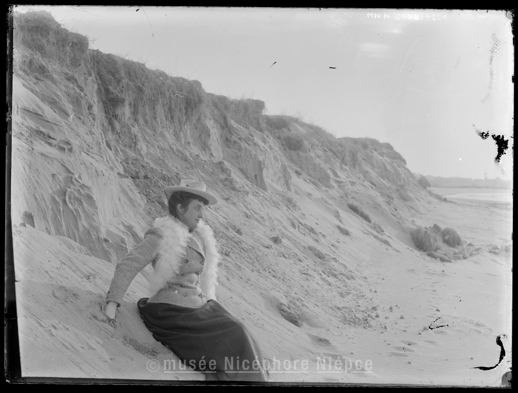 Madame Demachy assise au pied d'une dune