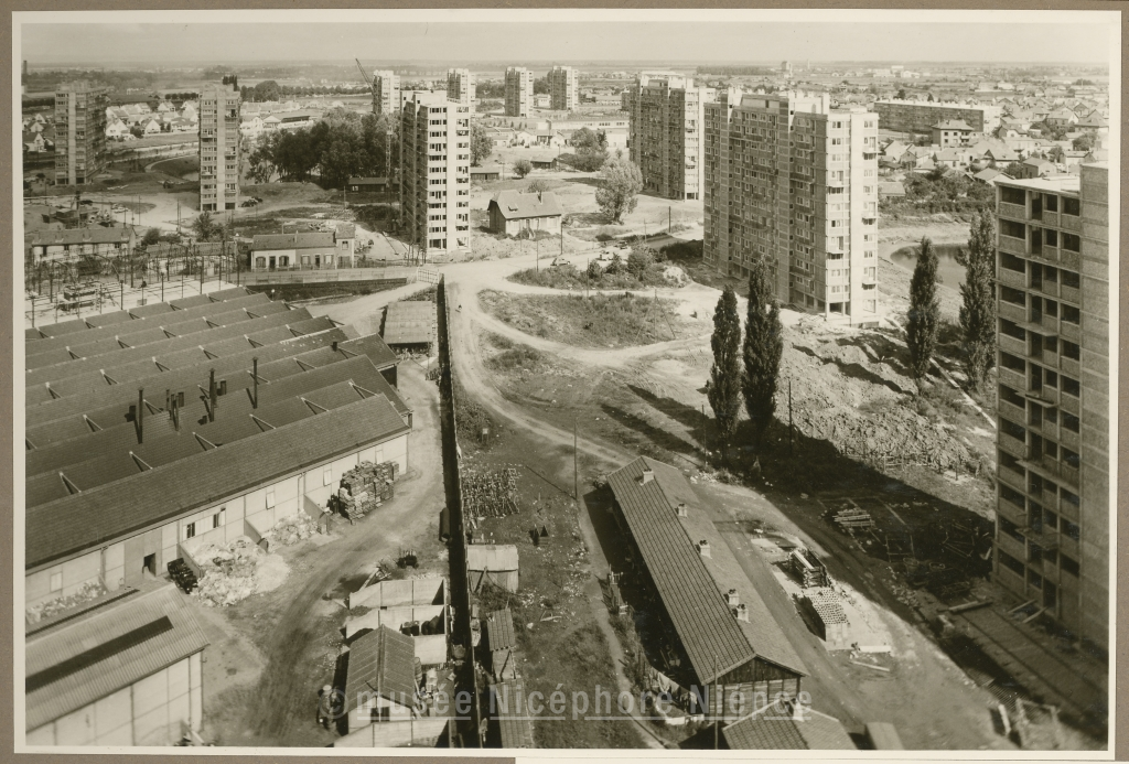 Quartier de l'Aubépin en cours d'aménagement Immeubles B12.05 [...] et A5.02 Usine de la SEVAEM Baraque provisoire, angle de l'immeuble B12.10 (19 Septembre 1958)
