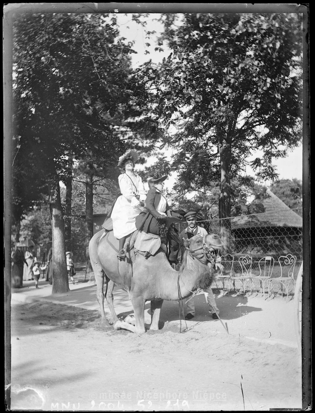 Deux femmes sur un chameau au jardin d'acclimatation