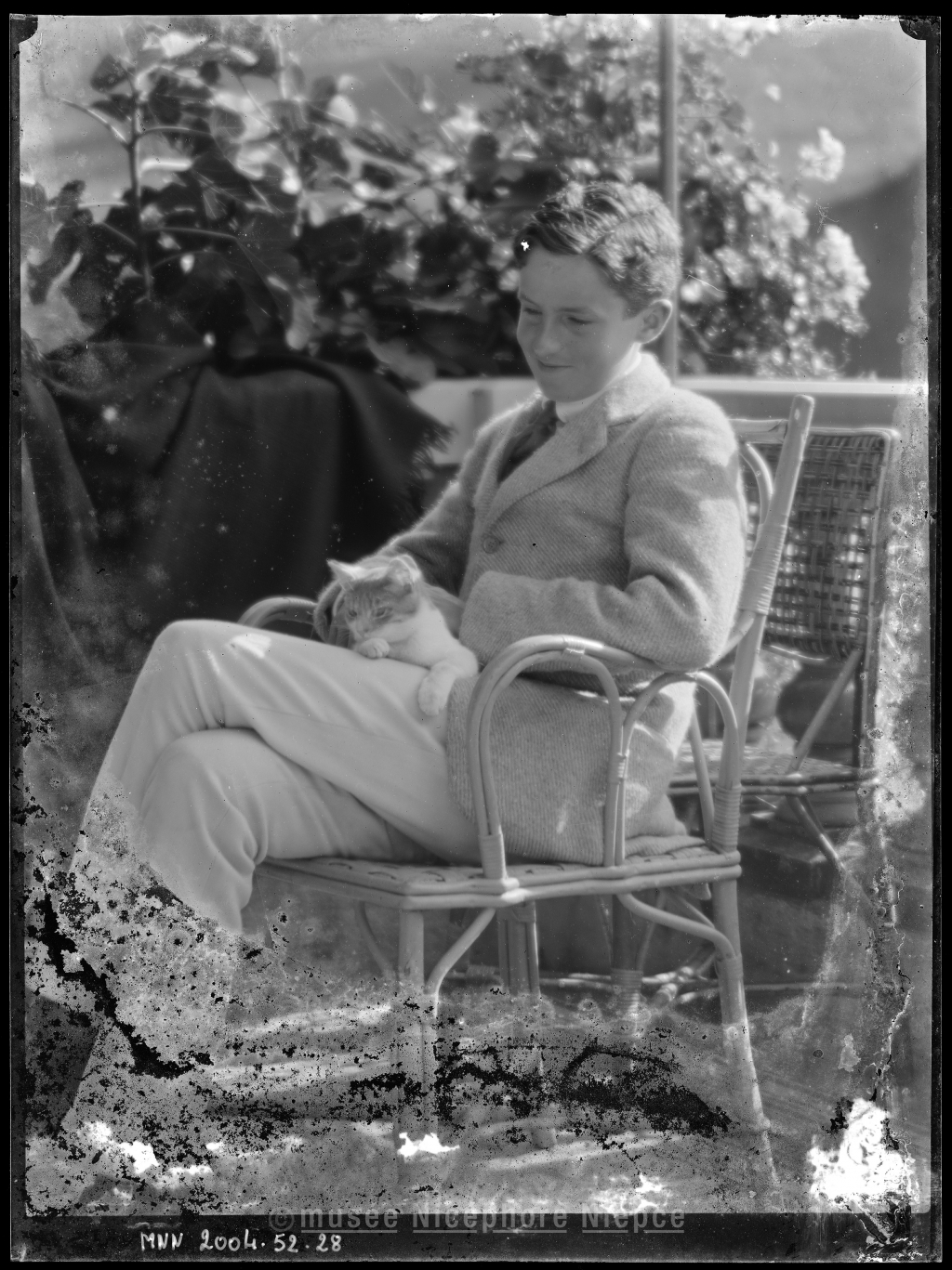 Bob sur la terrasse du château, tenant un chat dans ses bras